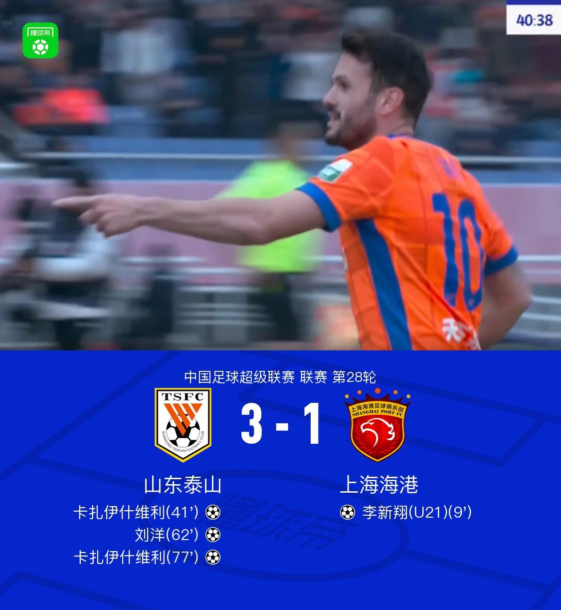 中超28轮山东3-1海港,卡扎伊什维利双响撑起泰山扛把子